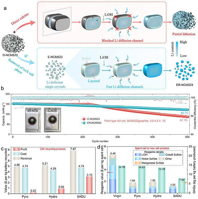 鉴于此,课题组提出了一种针对层状正极材料的表面预处理辅助升级修复技术(surface engineering assisted direct upcycling, SADU)。该技术基于不同化合价过渡金属元素与酸的反应活性差异,能够选择性地去除层状废料表面类岩盐结构,同时将多晶废料解离为单晶颗粒。刻蚀后的废料只需经过简单固相烧结并补充锂元素,即可实现结构与功能的修复。修复后的NCM523材料放电容量与商业化产品相当,且循环稳定性更为优异,在3.0-4.2 V(相对于石墨负极)下循环500周后,容量保持率为80.1%,远高于商业NCM523材料(57.1%)。经济与环境评估显示,该回收技术的利润分别是火法回收和湿法回收的14.2倍和3.4倍,而其温室气体排放量仅为火法回收的51.7%和湿法回收的57.6%。此外,该直接修复技术不仅适用于中低镍层状材料,还可拓展至其它层状材料,如钴酸锂或高镍层状氧化物,展现出巨大的产业化应用潜力。