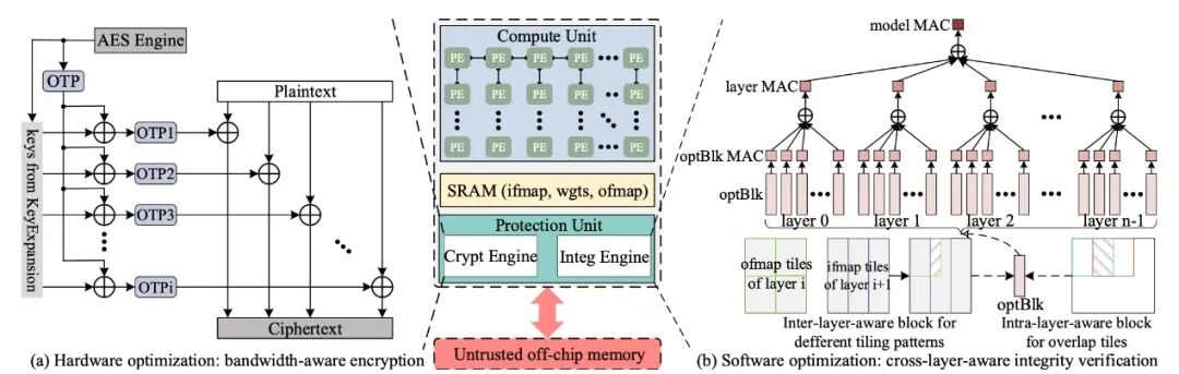 近年来安全DNN加速器备受关注。该研究提出了一种硬件和软件的协同优化机制,实现了高安全性和高效率的DNN加速器设计(见图3)。其核心创新包括:1)带宽感知加密机制,采用单个AES引擎并结合密钥扩展模块生成多个独特的一次性密码,从而在不增加硬件资源的情况下满足高带宽需求,防止了单元素碰撞攻击,并降低了硬件开销。2)多级完整性验证机制,引入了基于块、层和模型的多粒度完整性验证,减少了安全元数据的存储和访问需求,通过将层或模型粒度的安全元数据存储在加速器芯片内,几乎消除了对内存的额外访问开销,同时防止了重新排列攻击。3)还考虑了DNN模型中层内和层间的数据块对齐问题,避免了冗余的加密和解密操作,进一步提高了性能。