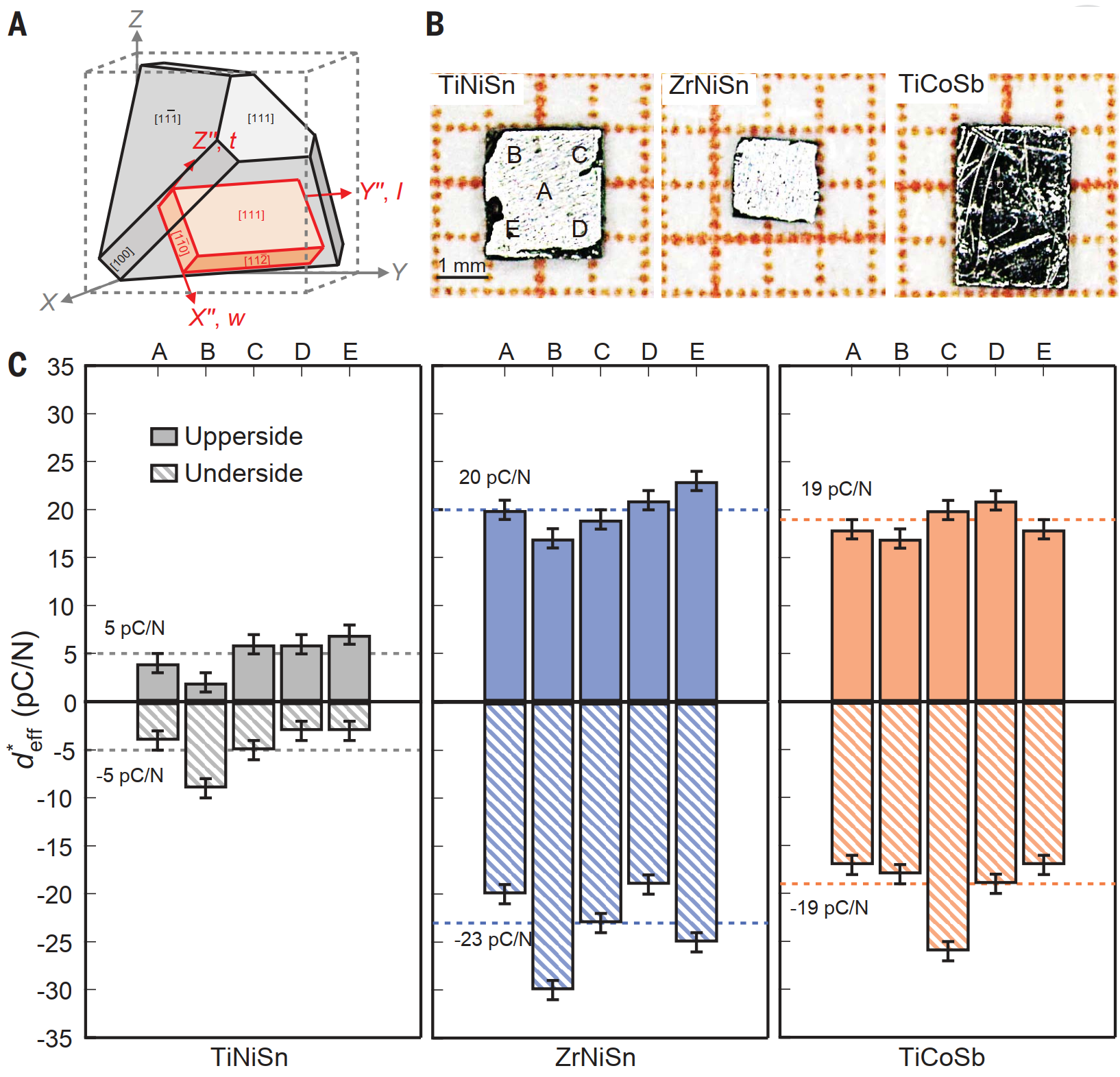 图1. 半赫斯勒TiNiSn, ZrNiSn和TiCoSb [111]切型晶片的压电系数