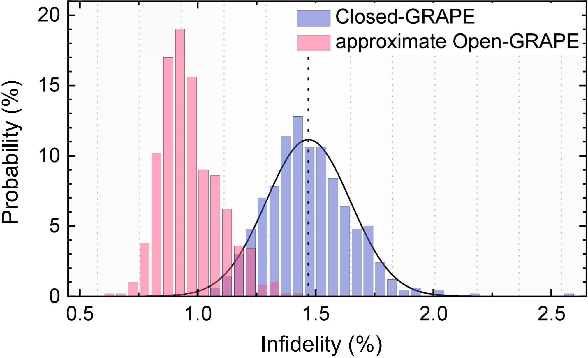 为此,该合作研究团队创造性融合封闭系统GRAPE算法框架与开放系统的算法理论(简称Open-GRAPE),开发出兼顾精度与效率的“近似Open-GRAPE算法”。该方案通过引入参数漂移与退相干噪声的低阶效应近似模型,将复杂开放系统的优化问题转化为可高效计算的形式。数值模拟显示,相比Closed-GRAPE算法,新算法生成脉冲的平均错误率从1.47%降至0.97%;而其生成错误率小于0.93%的脉冲,即处于Closed-GRAPE算法均值三个标准差外的高性能脉冲的概率提升了约340倍。研究团队进一步以二项式编码进行了实验验证,数据表明在编码的初始化与解码过程中平均错误率从1.84% 降至1.01%,而最低的错误率低至0.60%,处于领域领先的水平。