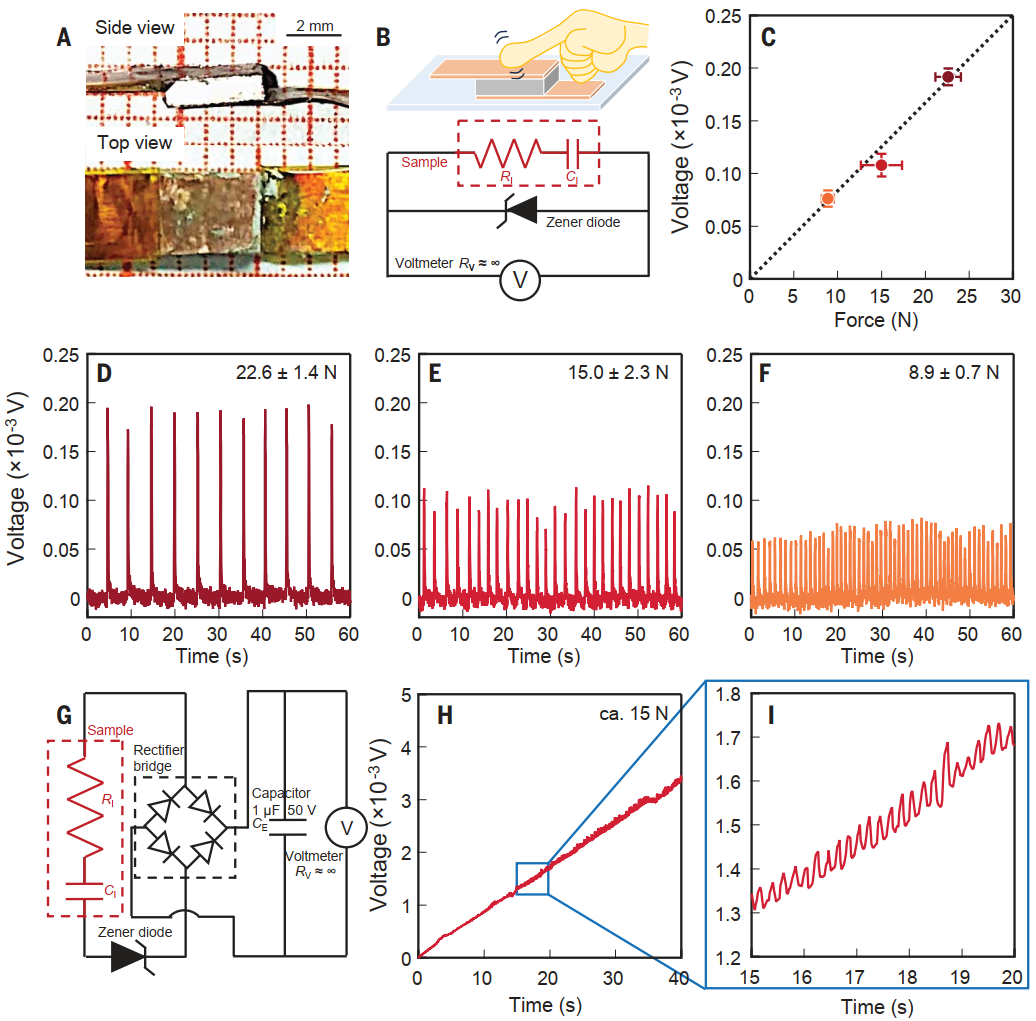 数关系,首次从在实验上确定了TiNiSn, ZrNiSn和TiCoSb的剪切压电应变系数d14分别约为8 pC/N、38 pC/N和33 pC/N。其中,ZrNiSn和TiCoSb单晶的剪切压电系数在非中心对称、非极性压电材料中属于较高数值,高于SiO2、GaSb等宽禁带压电材料。团队研发了基于TiCoSb- [111]切型晶片的压电器件,该器件在不同施力大小和持续时间下展现出了稳定的电压响应,且能够持续为电容器充电。此外,团队发现半赫斯勒材料在室温至1173K范围内表现出良好的热稳定性,其压电响应也在该温区保持稳定。这些结果表明半赫斯勒窄带半导体材料在压电领域具有潜在应用前景。值得注意的是,窄带半导体的压电效应机制起源可能不同于离子位移型的传统压电材料,该实验发现可能为新型压电材料设计及换能技术提供新的思路。此外,窄带半导体通常具有较为显著的光电、热电等效应,这为开发压电-光电、压电-热电等多功能效应协同的电子器件提供了新的可能。