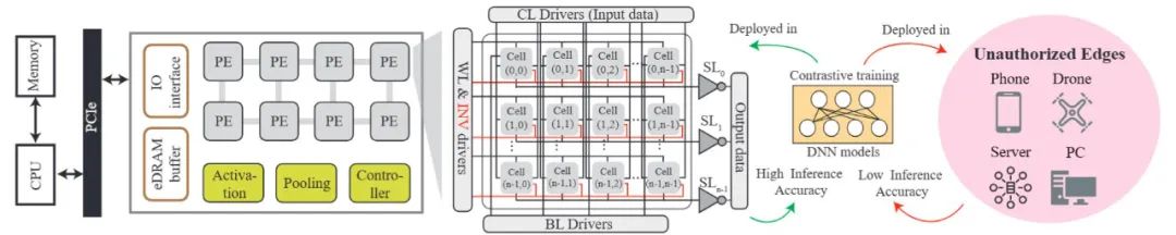 深度神经网络模型部署在基于忆阻器的存算芯片中存在模型安全问题。这是由于忆阻器的非易失性特点,使得断电情况下攻击者依然可以读取权值。为此,我们提出软硬件协同设计解决方案(见图2)。硬件方面,我们利用3T2R设计的可重构功能来实现模型的加密。这种可重构使得芯片在不同的密钥下具有不同的前向推理结果。软件方面,我们提出一种差异化对比训练方法,确保在授权芯片上模型具有较高的前向推理性能,而在未授权芯片上前向推理性能很低。在图像分类、分割以及生成任务上的大量实验验证了我们方法的有效性。我们的方法确保模型在授权芯片上几乎没有性能下降,而在未授权芯片上的性能降至随机猜测或生成。
