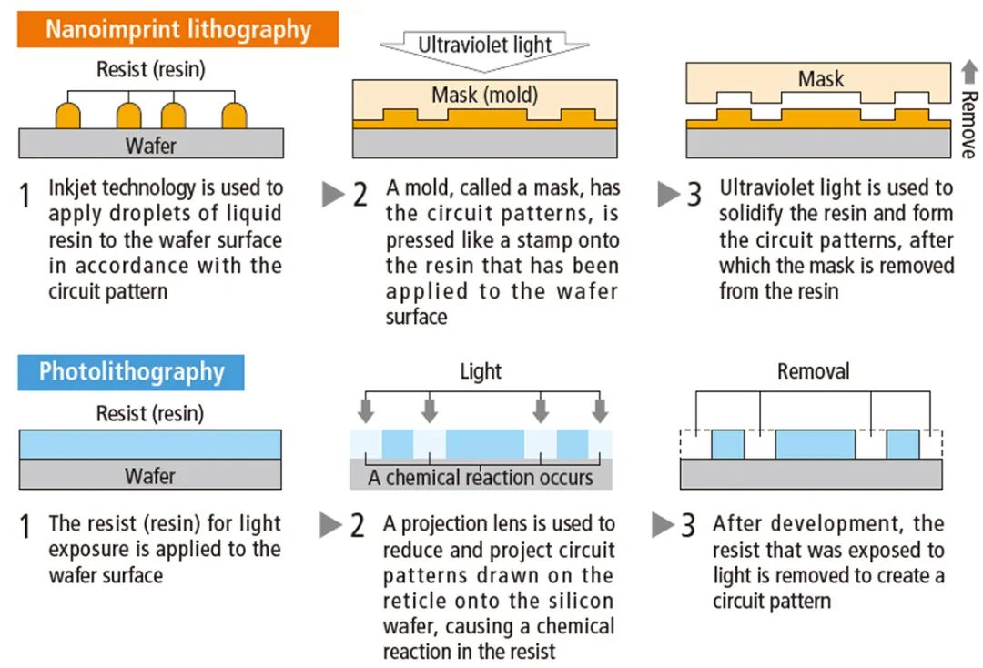 我们先来看下佳能的NIL。该技术是一种非光学光刻方案,通过物理模板直接将电路图案压印到晶圆上,跳过了传统光刻的光源投影等步骤。其工艺包括使用电子束刻制高精度母版、在晶圆上滴注液态树脂、通过模具压印图案,最后用紫外光固化树脂。
