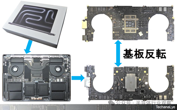 图 5显示的搭载M4 Max的MacBook Pro,于2024年11月发布。这是2023年11月发布的搭载M3 Max的MacBook Pro的继任者,其内部配置、结构和电路板尺寸与2023年型号几乎完全相同。主要的变化是处理器从M3 Max更换为M4 Max,接口从Thunderbolt 4改为Thunderbolt 5。