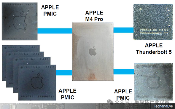 图3显示了最新Mac mini中的Apple芯片组(省略了更多芯片)。总共有六颗电源IC围绕M4 Pro处理器排列。它管理电源电压等。