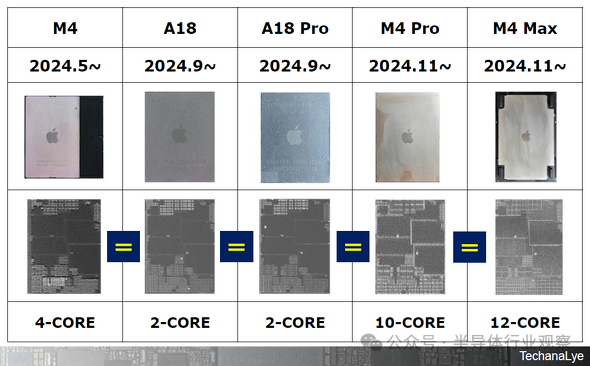 表1比较了采用3nm第二代台积电N3E工艺的苹果2024-2025芯片的PCPU外观。从A18到 M4 Max,PCPU都是相同的。唯一的区别是核心的数量。GPU、NPU和ECPU也是如此。每个核心都经过精心打造,并且通过核心数量实现可扩展性。