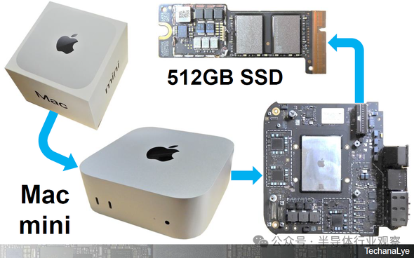 图1显示了Mac mini的主板(其中还包含电源板)以及连接到主板的SSD。它的形状与典型的M.2 SSD不同。图1中的SSD是双面的,背面也有一个内存芯片。