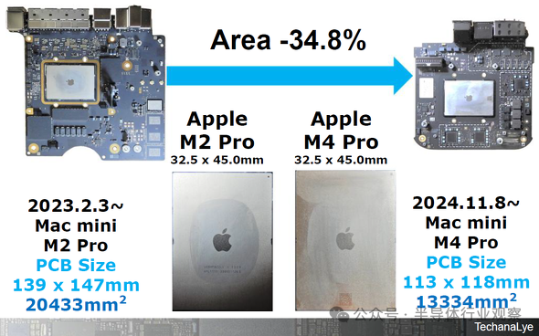 图4展示了2023年2月推出的上一代Mac mini和M2 Pro以及2024年推出的新款Mac mini和M4 Pro的电路板。电路板面积大约是其三分之二,但处理器封装尺寸保持不变。M2 Pro 采用5nm工艺,而M4 Pro采用3nm工艺制造,因此处理器更小并不意味着主板也更小。通过彻底重新设计电路板,Mac mini变得更小了。毫无疑问,这一切的背后是半导体的进化,通过电源IC的优化、以及更低的处理器电压,使得整个主板可以变得更小。苹果不断关注半导体特性并改变电路板配置。