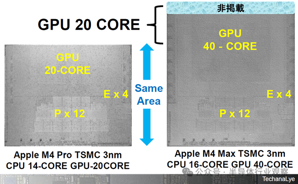 图8为M4 Pro、M4 Max芯片打开状态(省略布线层剥离的详细内部照片)。M4 Pro已宣布拥有10核PCPU(性能CPU)和4核ECPU(效率CPU),但实际硅片有12核PCPU。这个数字与M4 Max的12个核心相同。三分之二的硅是完美匹配的。M4 Pro+20 核GPU=M4 Max。通过标准化设计资产,可以提高开发效率。通过标准化CPU和NPU,测试也可以重复使用。