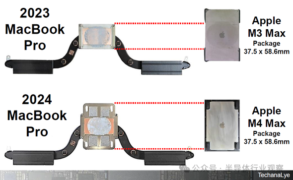图7比较了2023款配备M3 Max的MacBook Pro和2024款配备M4 Max的MacBook Pro的散热器。在M3 Max上,散热器仅与处理器重叠,但在M4 Max上,它已更改为也覆盖统一内存。已采取防止发热的措施,包括针对内存。苹果产品不断发生着微小的改变。