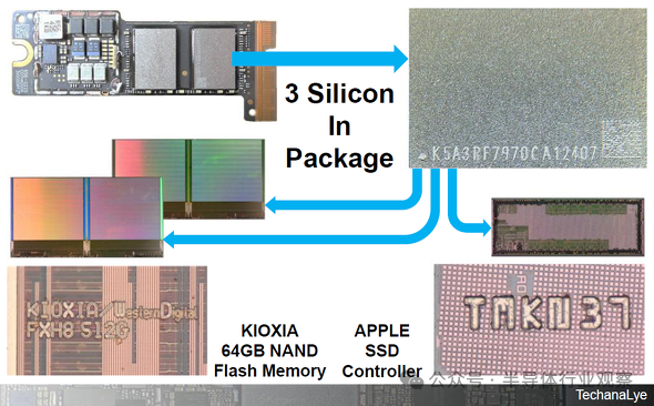 图2是Mac mini的SSD芯片被打开。512GB型号有四个内存芯片(两侧)。每个都是128GB。一个封装里面有三片硅片。其中两颗是来自Kioxia的64GB NAND闪存,一颗是苹果研发的SSD控制芯片。提供SSD的控制功能和接口。虽然典型的SSD都有一个管理整个SSD 的单芯片控制器,但Apple在每个封装中都有一个控制器。Apple对于内存控制也有自己独特的做法。苹果产品不仅使用铠侠的内存芯片,还使用三星电子、SK海力士、美光科技等公司的内存芯片,并且始终使用苹果的控制器。