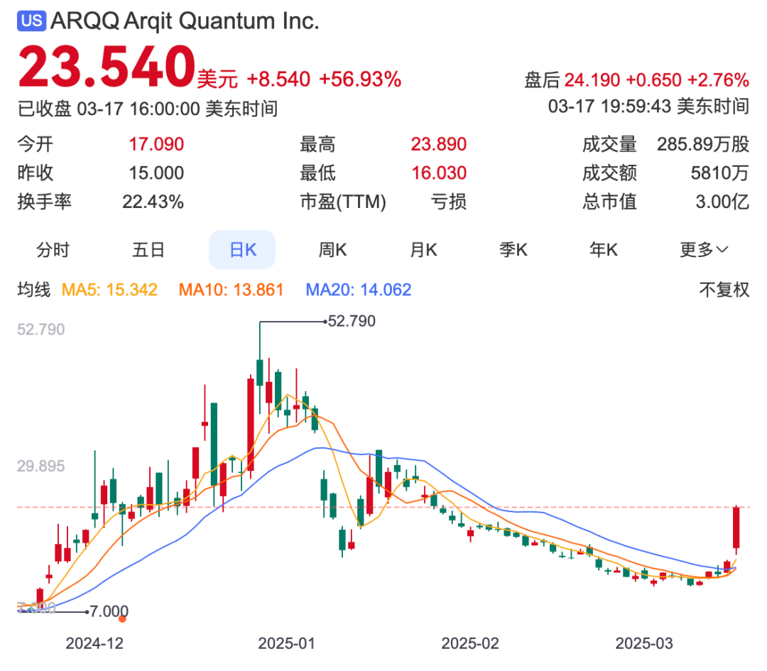 3月17日,美国量子计算概念股再度大涨,其中ARQQ暴涨56.93%;QMCO暴涨40.09%;QBTS涨10.15%;QUBT涨13.12%。