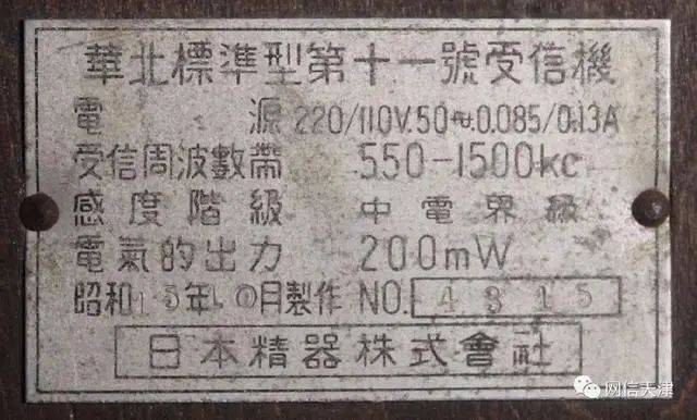 图注:天津产“华北十一号”再生收音机铭牌