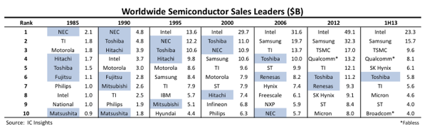 从1986年到1991年,NEC曾经是世界上最大的半导体企业。从1992年到1999年,是仅次于英特尔的全球第二大半导体企业。