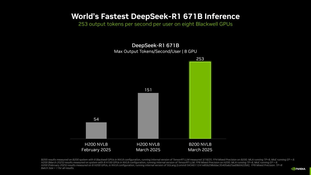 通过硬件和软件的结合,自今年 1 月以来,英伟达在 DeepSeek-R1 671B 模型上的吞吐量提升了约 36 倍,每 token 的成本效率提高了约 32 倍。