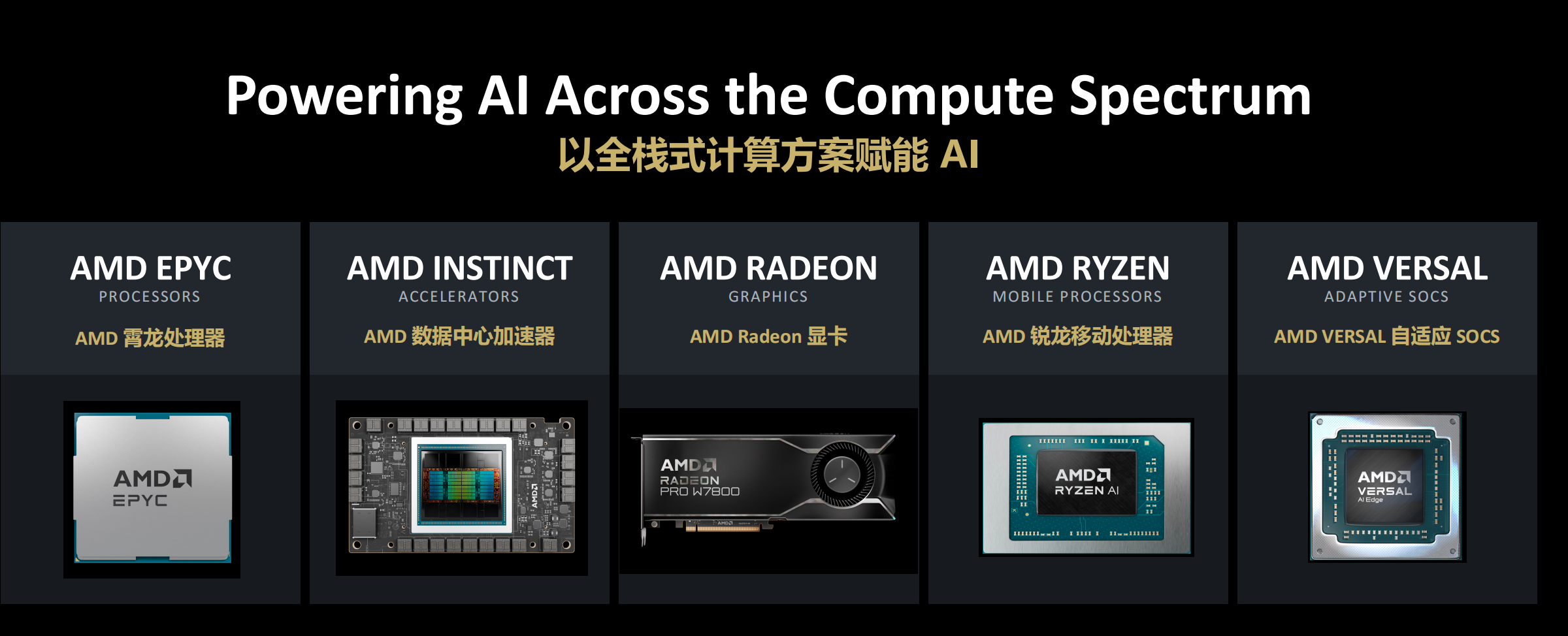 但苏姿丰同时指出,人们没有充分意识到的是,对于AI硬件而言,并没有唯一的解决方案,针对不同场景和用例,需要不同类型的计算引擎。而AMD拥有包括服务器处理器,数据中心加速器,GPU、CPU和自适应SoC,能够以全栈式计算方案赋能AI,从而满足广泛的工作负载。