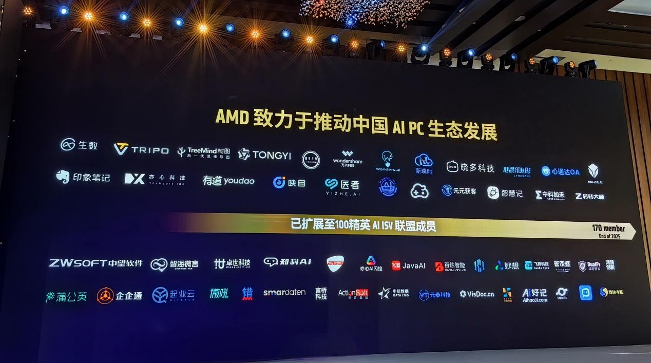 据潘晓明介绍,目前,AMD主导的中国AI PC应用创新联盟,自2024年3月启动以来,ISV合作伙伴已经超过100家,包括腾讯元宝、百川智能、钉钉等,预计今年底联盟成员将达到170家。