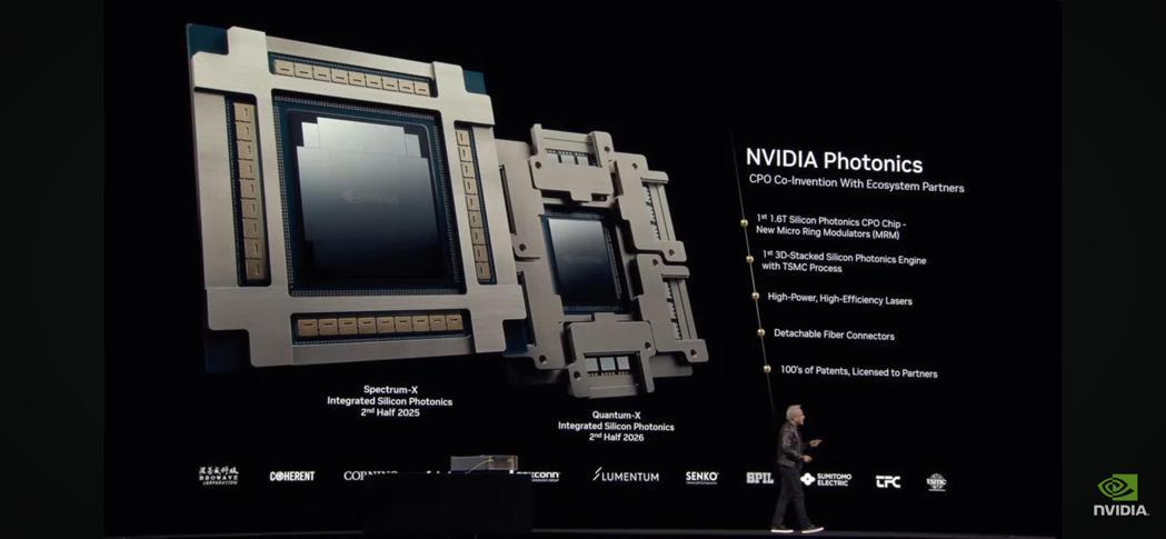 黄仁勋在屏幕中除了列出全球首款3D堆叠硅光子引擎英伟达Spectrum-X与英伟达Quantum-X 硅光子网络交换器,强调将可让AI工厂能够跨越不同地点连接数百万个GPU,同时大幅降低能耗与经营成本。