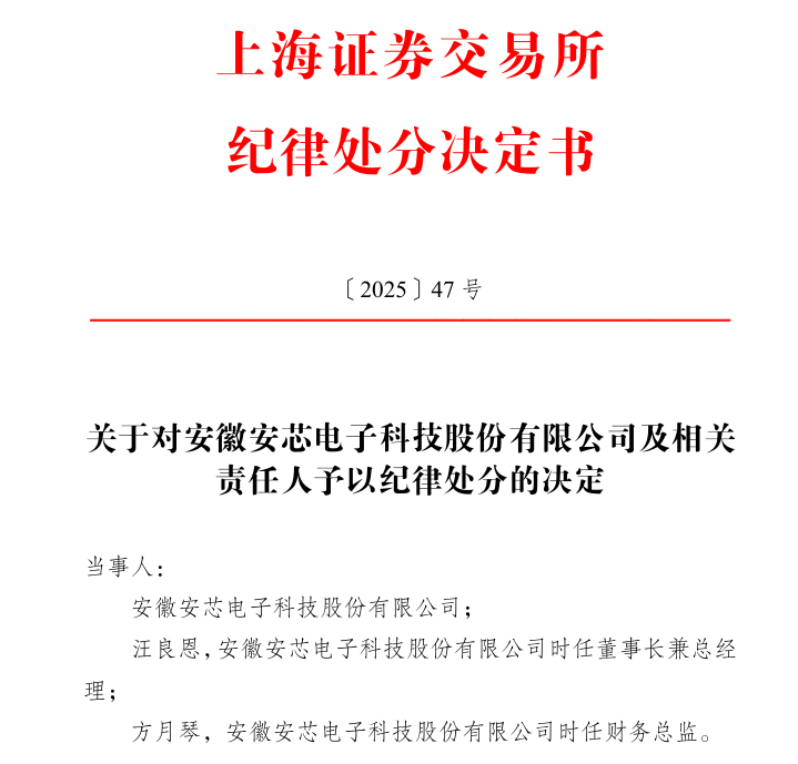 为此,上交所对安芯电子予以1年内不接受其提交的发行上市申请文件的纪律处分,对汪良恩、方月琴予以公开谴责。