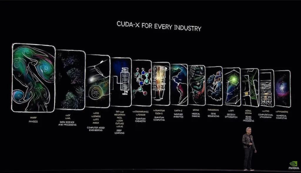 「英伟达打造芯片,但我们是一家算法公司。」黄仁勋说到。这种对于算法的储备和精通,让英伟达和 CUDA 可以帮助其他团队形成自己的算法,来探索基础学科和领域。