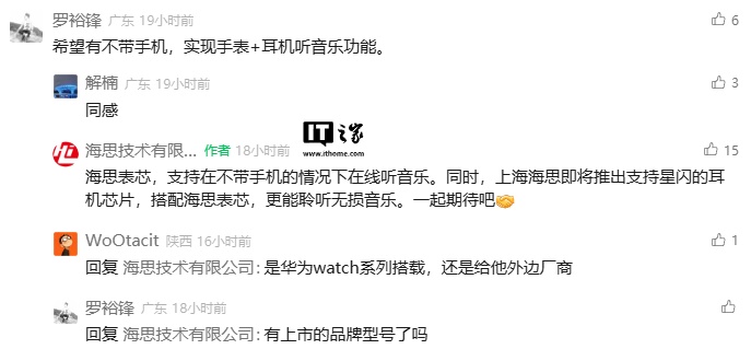 IT之家注意到,上海海思在该文章的评论区中还回复了关于星闪耳机的问题:“海思表芯,支持在不带手机的情况下在线听音乐。同时,上海海思即将推出支持星闪的耳机芯片,搭配海思表芯,更能聆听无损音乐。”