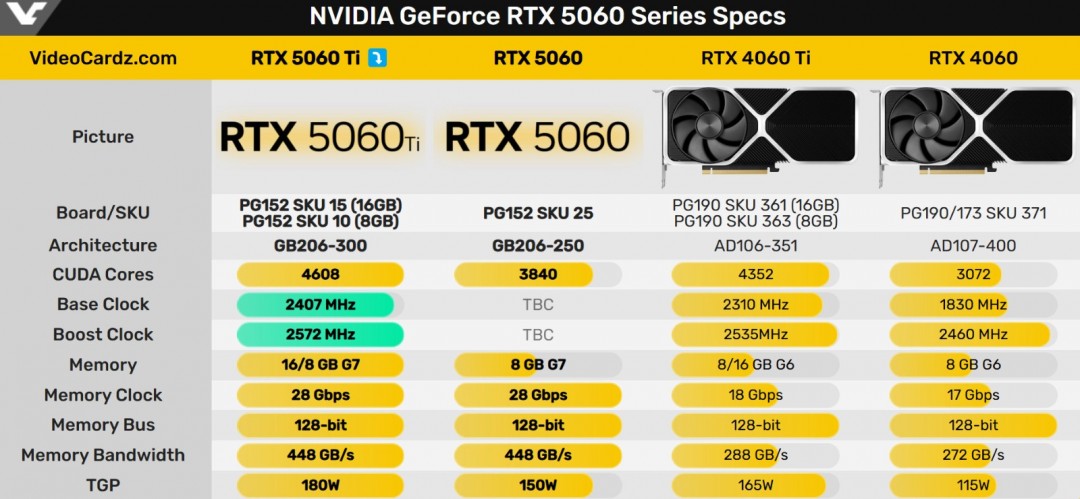 Videocardz已经放出了RTX 5060 Ti的完整规格以及RTX 5060除GPU频率外的规格,当中RTX 5060 Ti采用GB206-300 GPU,拥有4608个CUDA核心,有两种PCB,分别是PG152 SKU 15和PG152 SKU 10,前者是16GB版本用的,后者则是8GB版本的。两种显存容量的均会搭配128bit GDDR7显存,显存速度28Gbps,换算过来带宽高达448GB/s,比RTX 4060 Ti高出55%。