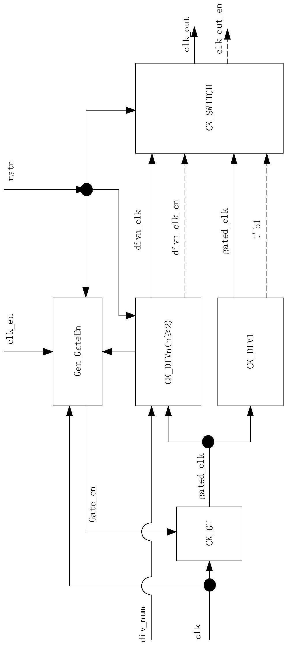 本公开涉及时钟分频器、时钟分频方法及片上系统。时钟分频器包括:驱动时钟输入端,用于接收驱动时钟信号;分频比输入端,用于接收分频比信号;门控输入端,用于接收门控信号;时钟输出端,用于输出目标时钟信号;第一处理模块,被配置为当门控信号指示启用所述时钟分频器时,根据分频比信号来处理所述驱动时钟信号,以生成与分频比信号对应的目标时钟信号;以及第二处理模块,被配置为当门控信号指示禁用所述时钟分频器时,停止第一处理模块的操作。