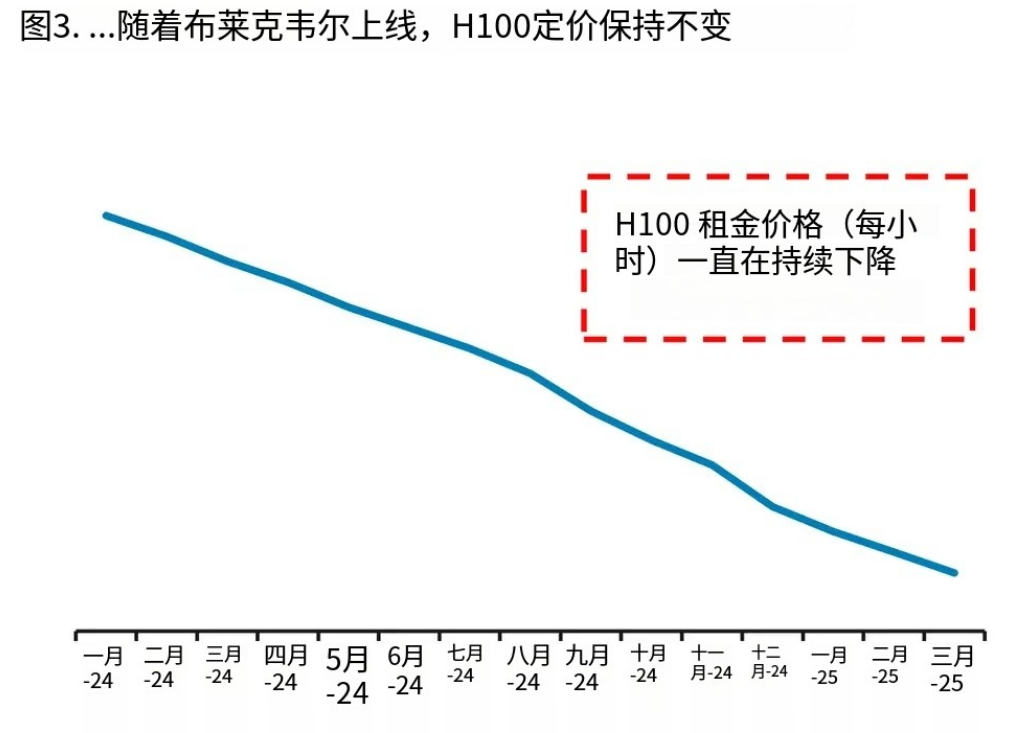桑德勒在研究报告中附上了一张图表。图表显示了租赁使用英伟达旧版Hopper架构的H100 GPU的成本。可以看到,随着该公司更好的新型Blackwell GPU供应增加,租赁价格已经暴跌。