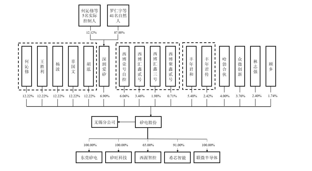 2003 年 12 月,何沁修、王胜利、杨波、辜国文四人在深圳开启创业,次年 8 月,胡泓加入团队。在股权结构上,何沁修、王胜利、杨波、辜国文、胡泓通过直接和间接持股合计控制公司67.99%的表决权实现对公司的控制。值得注意的是,创始团队人持股比例几乎一致,五人一起为公司控股股东、实际控制人,且直接持股比例均为12.22%,并通过担任员工持股平台深圳爱矽的普通合伙人控制公司6.90%的表决权。