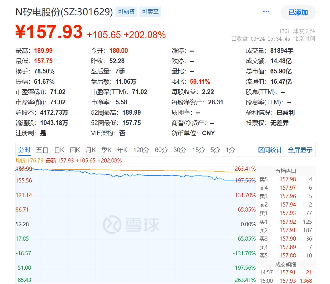 上市首日,矽电股份高开244%,股价盘中一度逼近190元。截至收盘,矽电股份报157.93元/股,涨202.08%,市值超65.9亿元。