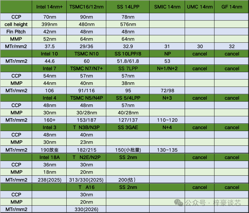 由于多少nm已经失去对比意义,所以行业一般会用MTr/mm2每平方毫米百万晶体管,也就是晶体管密度来衡量,每一家工艺的性能水平。