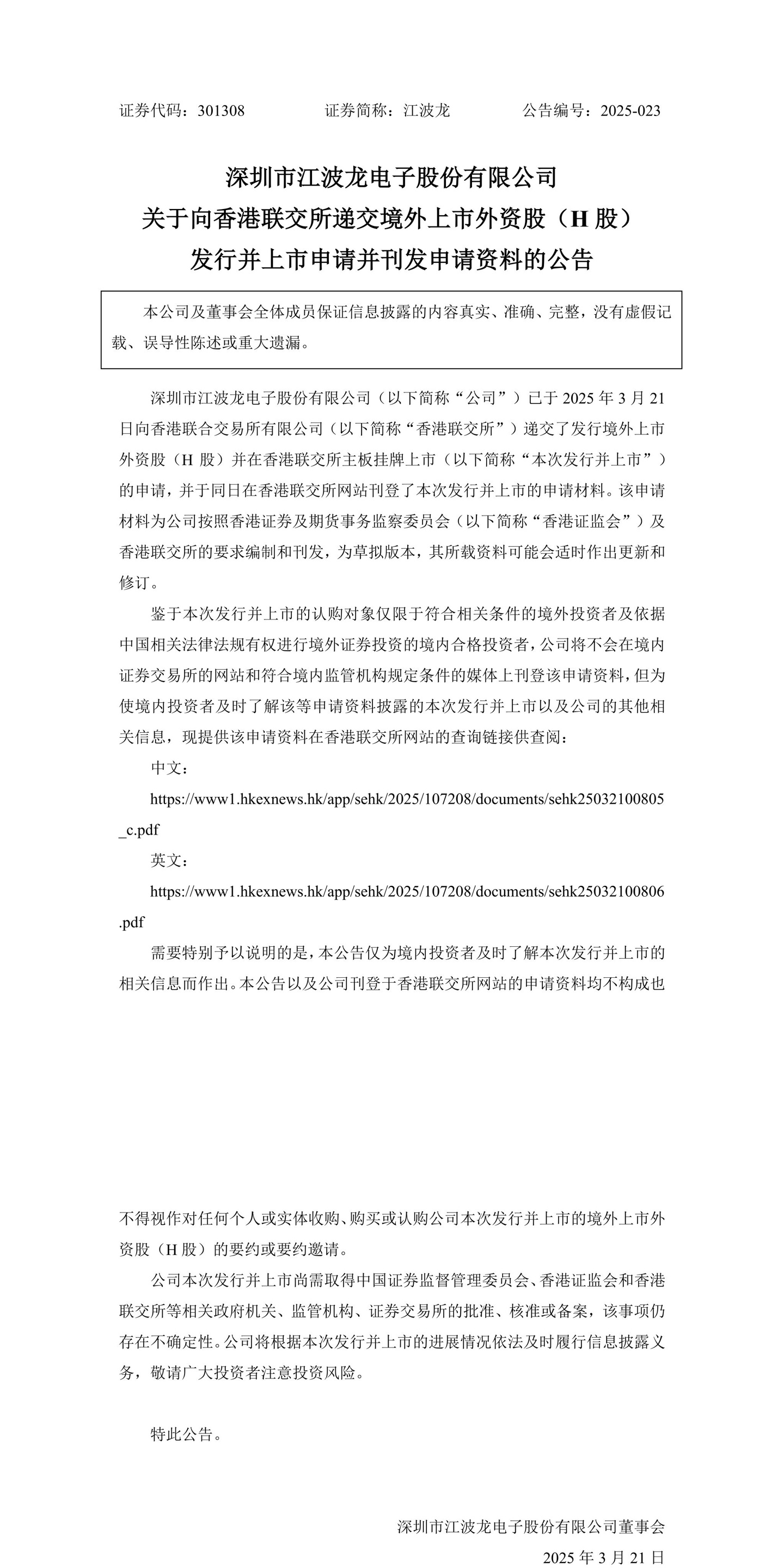 IT之家 3 月 25 日消息,存储企业深圳市江波龙电子股份有限公司在公告中确认,已于 2025 年 3 月 21 日向香港联合交易所有限公司(IT之家注:即“香港联交所”)递交了发行境外上市外资股(H 股)并在香港联交所主板挂牌上市的申请,并于同日在香港联交所网站刊登了本次发行并上市的申请材料。