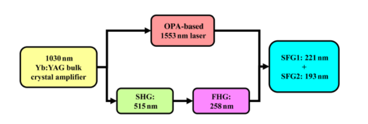 将自制 Yb:YAG 晶体放大器中的 1030 nm 激光的一部分通过四次谐波产生,生成 258 nm 激光(1.2 W),其余部分用于泵浦一个光学参量放大器,产生 1553 nm 激光(700 mW)。这些光束在级联 LiB3O5 晶体中的频率混合产生平均功率为 70 mW、线宽小于 880 兆赫的 193 nm 激光。通过在频率混合前将螺旋相位板引入 1553 nm 光束,我们生成了一个携带轨道角动量的涡旋光束。