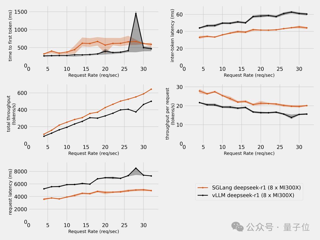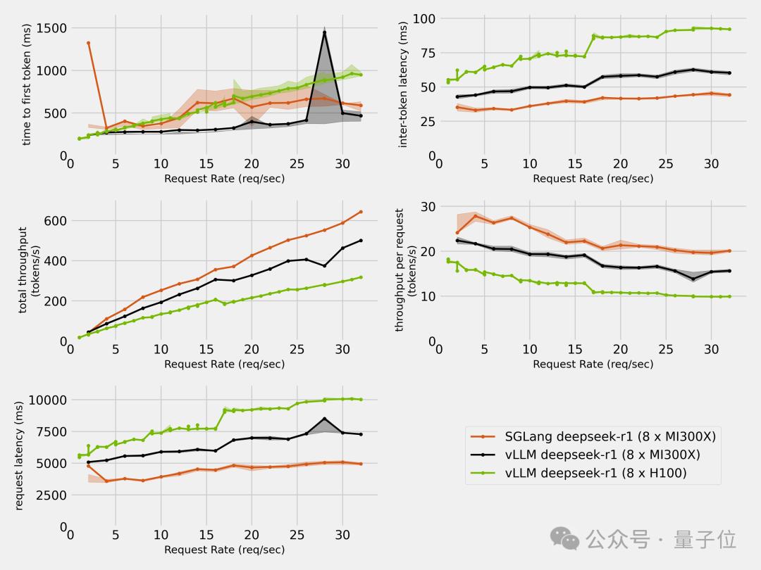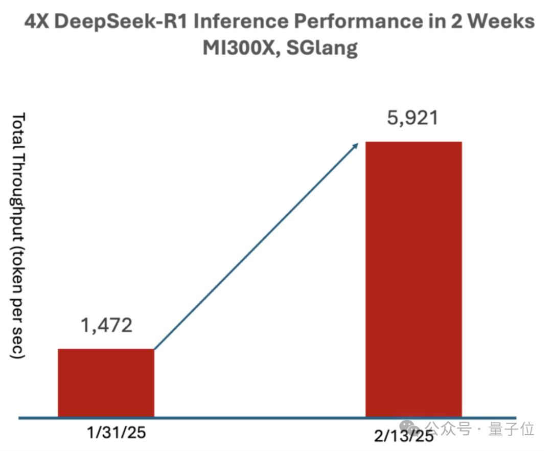 在稍早一些的测试当中,使用SGLang在MI300X上运行DeepSeek-R1,仅过了两周就相比于day 0时性能提升到了4倍,吞吐量达到了每秒5921 Tokens。