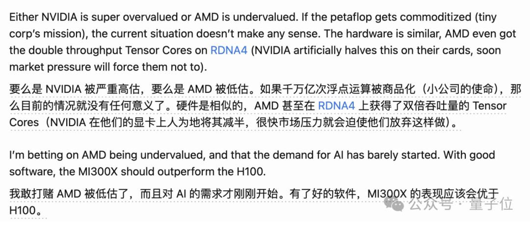 之前著名黑客George Hotz也曾表示自己非常看好AMD,认为只要有好的软件MI300X表现就能超越H100。