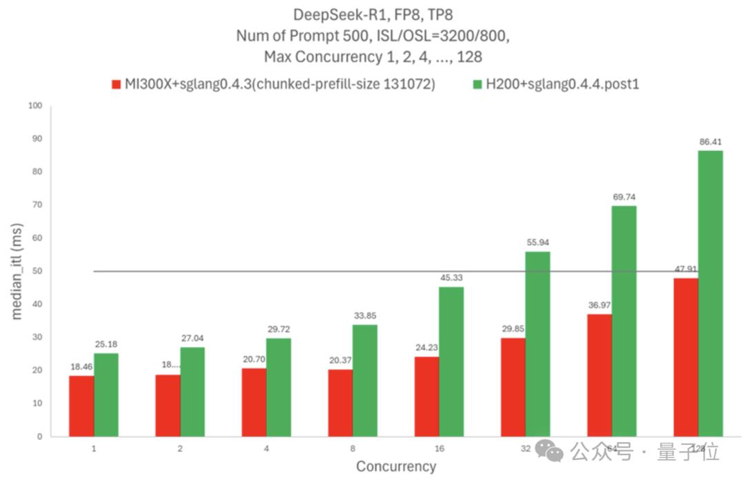 如果需要Token间延迟不超过50毫秒,一个H200节点可以处理16个并发请求,MI300X节点则可以处理128个。