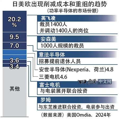 英飞凌将裁员1400人,并调整1400人的岗位。排在第2位的美国安森美也表示,将以约1000人为对象进行人员调整。排在第3位的瑞士意法半导体(STMicroelectronics)宣布了实施提前退休人员招募的方针。