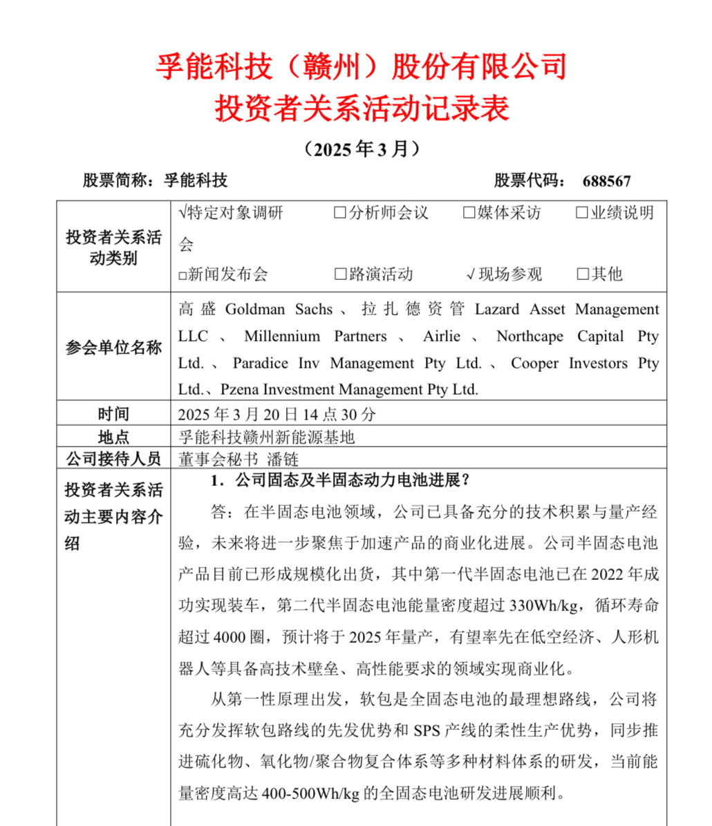 IT之家 3 月 25 日消息,孚能科技在 3 月的投资者关系活动记录表中透露,公司半固态电池产品目前已形成规模化出货,其中第一代半固态电池已在 2022 年成功实现装车,第二代半固态电池能量密度超过 330Wh/kg,循环寿命超过 4000 圈,预计将于 2025 年量产,有望率先在低空经济、人形机器人等具备高技术壁垒、高性能要求的领域实现商业化。