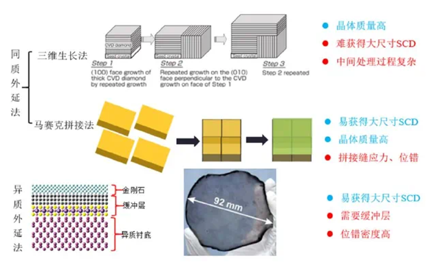 根据李成明的介绍,近年来金刚石功率电子学在材料和器件方面均有新的技术突破。在材料方面,采用高温高压法制备的单晶金刚石直径已达20mm,且缺陷密度较低。如果是采用化学气相沉积(CVD)法,同质外延生长的独立单晶薄片具有缺陷密度低的特点,最大尺寸可达1英寸;采用“平铺克隆”晶片的马赛克拼接技术生长的金刚石晶圆可达2英寸。而采用金刚石异质外延技术的晶圆可达4 英寸。如果是低成本的异质外延CVD法,金刚石多晶薄膜的发展和应用已很活跃,晶圆已达8英寸,已可作为导热衬底,用于新一代GaN功率电子器件。