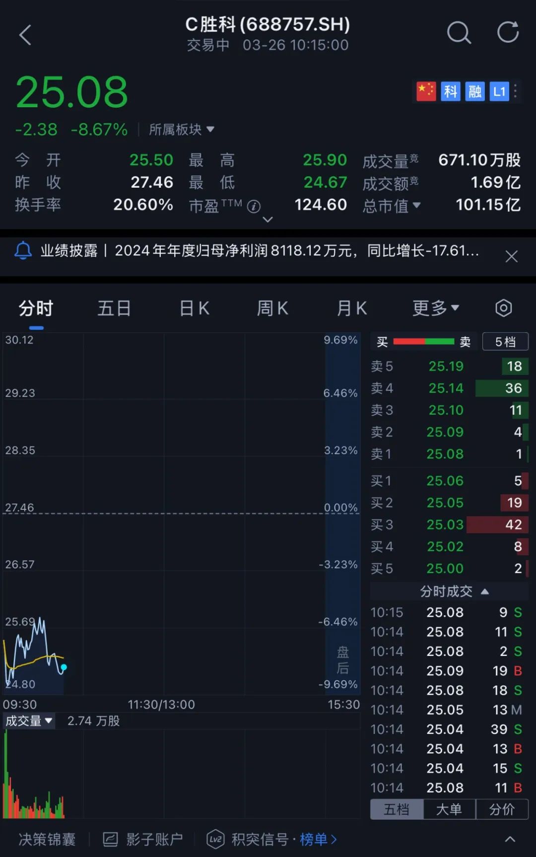 芯东西3月26日报道,3月25日,苏州“芯片全科医院”胜科纳米成功登陆科创板,发行价为每股9.08元,发行市盈率为42.64倍,上市首日大涨202.42%,以27.46元/股收盘。今日胜科纳米开盘下跌7%,最新总市值为101亿元。