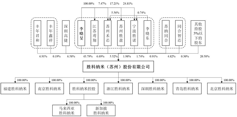截至招股书签署日,胜科纳米有9家控股子公司,其控股股东、实际控制人李晓旻过直接和间接方式合计控股59.72%,包括直接持股43.79%,以及通过江苏鸢翔、苏州禾芯、苏州胜盈、宁波胜诺间接持股。