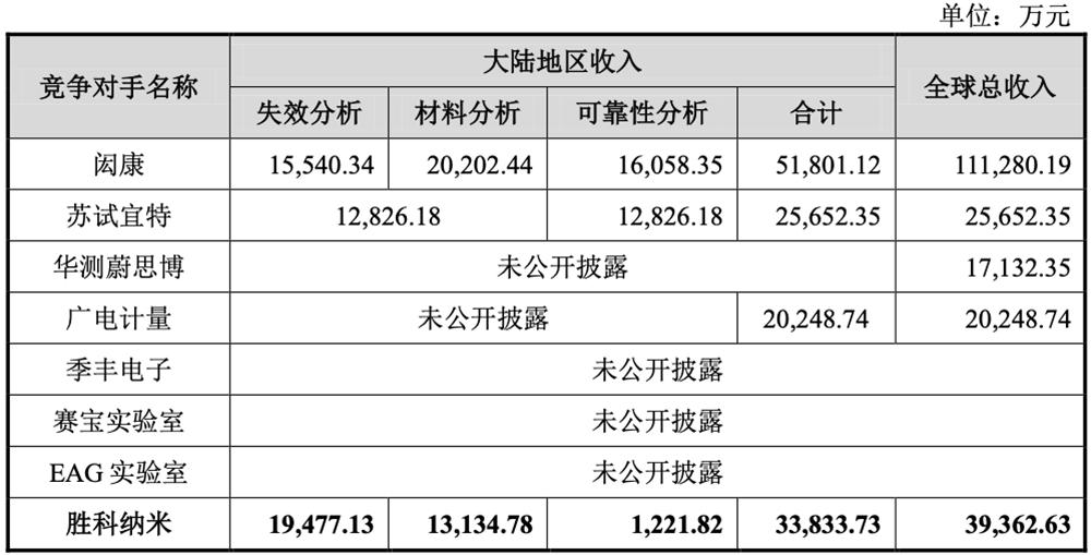 相对于闳康、赛宝实验室等第三方实验室检测机构,胜科纳米在大陆地区的业务起步时间较晚,业务现处于快速开拓和高速发展过程中,总收入规模较闳康等企业仍有一定差距。
