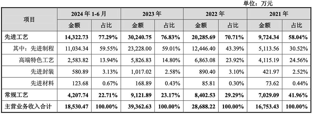 报告期各期,该公司来自于先进制程(28nm及以下制程)、高端特色工艺(高性能模拟芯片、高集成度射频芯片、高容量内存芯片、高密度光电器件、功率半导体器件等)、先进封装(混合键合、晶圆级封装、2.5D封装、3D封装、系统级封装等)、先进材料(第三代半导体材料、大硅片、光刻胶)等先进工艺领域的收入规模较高且逐年上涨,2024年上半年收入占比达77.29%。