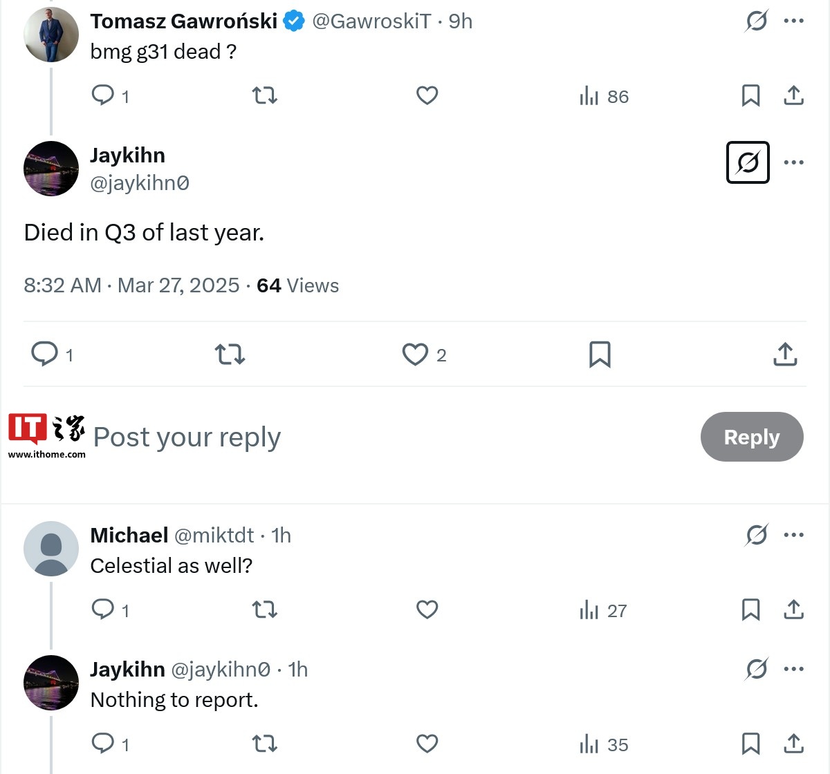 IT之家 3 月 27 日消息,X 平台消息人士 Jaykihn (@jaykihn0) 北京时间今日宣称,英特尔的 BMG-G31 独立显卡 GPU 芯片“已死于去年三季度”,而对于下一代 Celestial 世代 GPU 的情况他无可奉告。