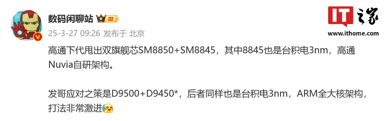 IT之家 3 月 27 日消息,消息博主 @数码闲聊站 今日表示,联发科今年下半年在高端手机应用处理器(IT之家注:AP)市场上除天玑 9500 外还将推出一款天玑 9450 芯片,以激进打法应对高通的 SM8850 + SM8845“双旗舰”策略。