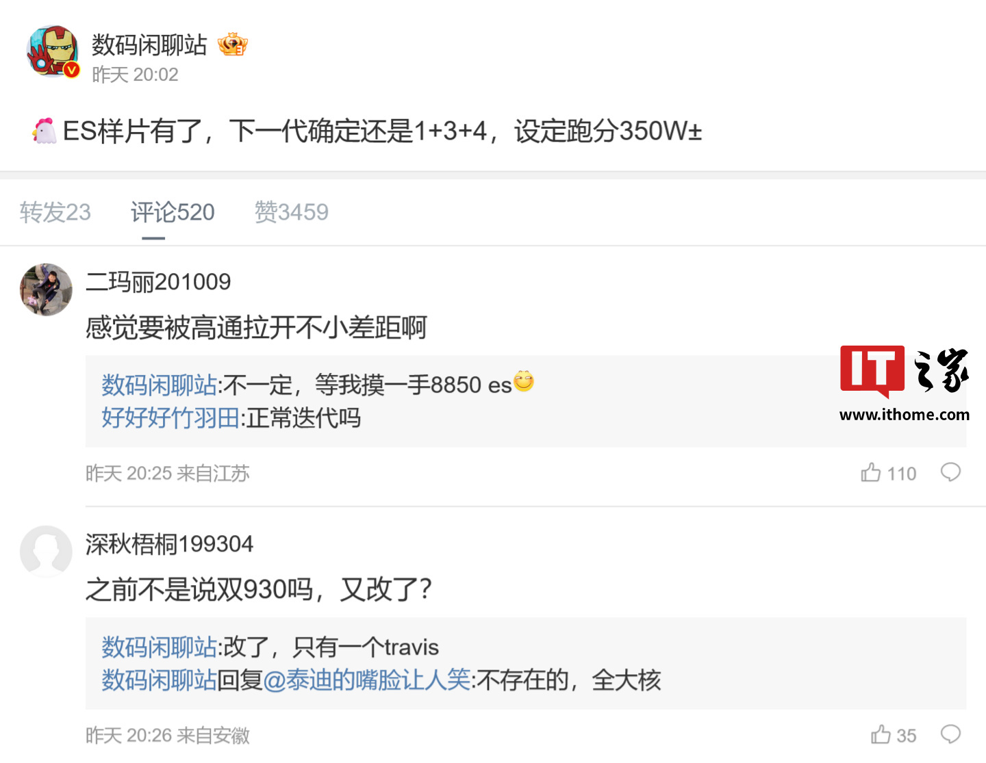 对于天玑 9500,这位博主在昨晚微博动态中表示,根据样片情况该处理器将采用 1+3+4 设计,虽然同样延续“全大核”核心配置,但 Cortex-X930 "Travis" 超大核心的数量降至 1 个,设定(安兔兔)跑分在 350 万左右。