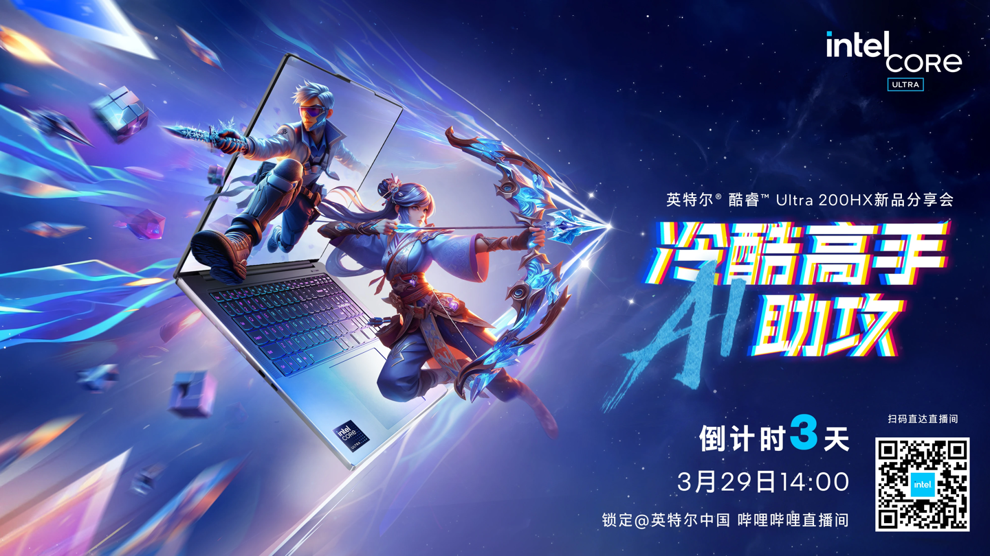 IT之家 3 月 28 日消息,英特尔中国本月 26 日表示将于明日(3 月 29 日)14:00 举行英特尔酷睿 Ultra 200HX 处理器新品分享会活动,迎接今年度游戏本的集中发布。