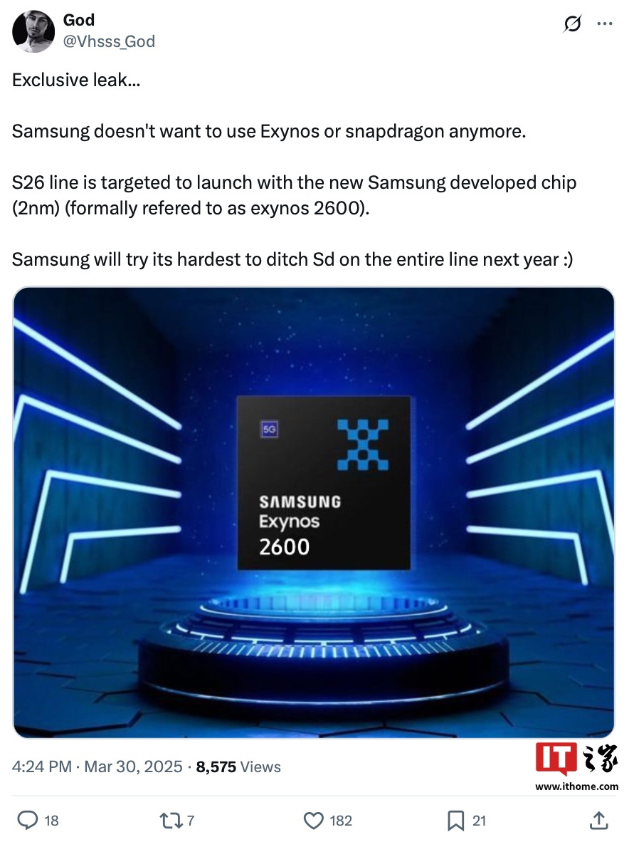 IT之家 3 月 31 日消息,综合外媒 Wccftech 和消息源 Vhsss_God 透露,三星旗下 Exynos 2600 芯片将进行改名,以实现“品牌形象重塑”。