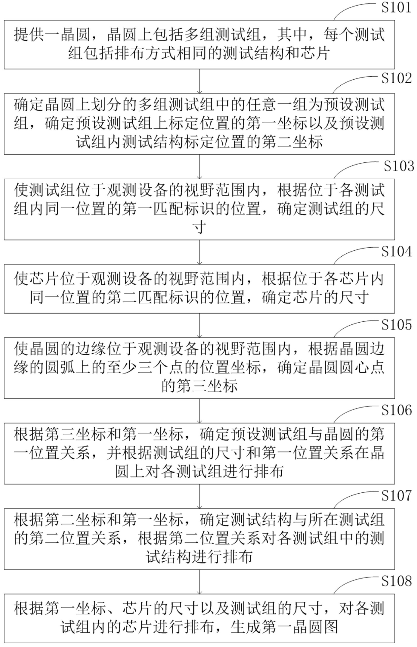 本申请提供了一种生成晶圆图的方法、装置及测试晶圆的设备,包括:确定晶圆上划分的多组测试组中的任意一组为预设测试组,确定预设测试组上标定位置的第一坐标以及预设测试组内测试结构标定位置的第二坐标;确定预设测试组与晶圆的第一位置关系,并根据测试组的尺寸和第一位置关系在晶圆上对各测试组进行排布;根据第二坐标和第一坐标,确定测试结构与所在测试组的第二位置关系,根据第二位置关系对各测试组中的测试结构进行排布;根据第一坐标、芯片的尺寸以及测试组的尺寸,对各测试组内的芯片进行排布,生成第一晶圆图。不受测试组内芯片数量的影响,极大的提高了生成晶圆图的效率。