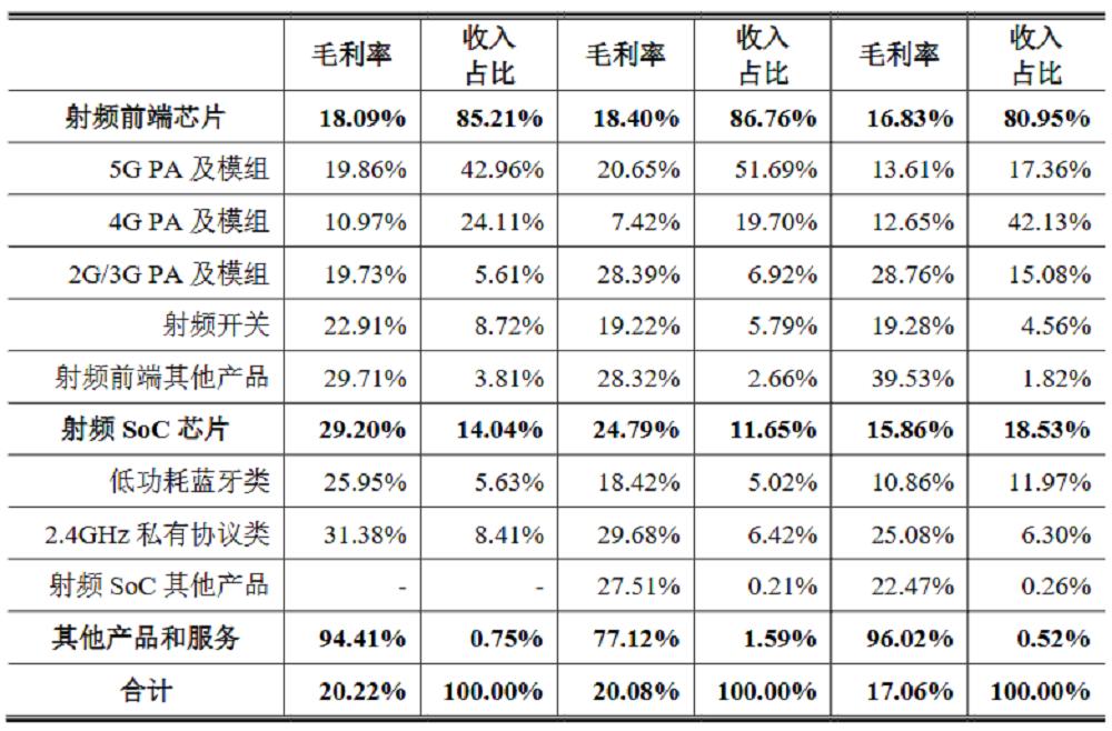 昂瑞微分产品线毛利率情况(图源:昂瑞微招股书)
